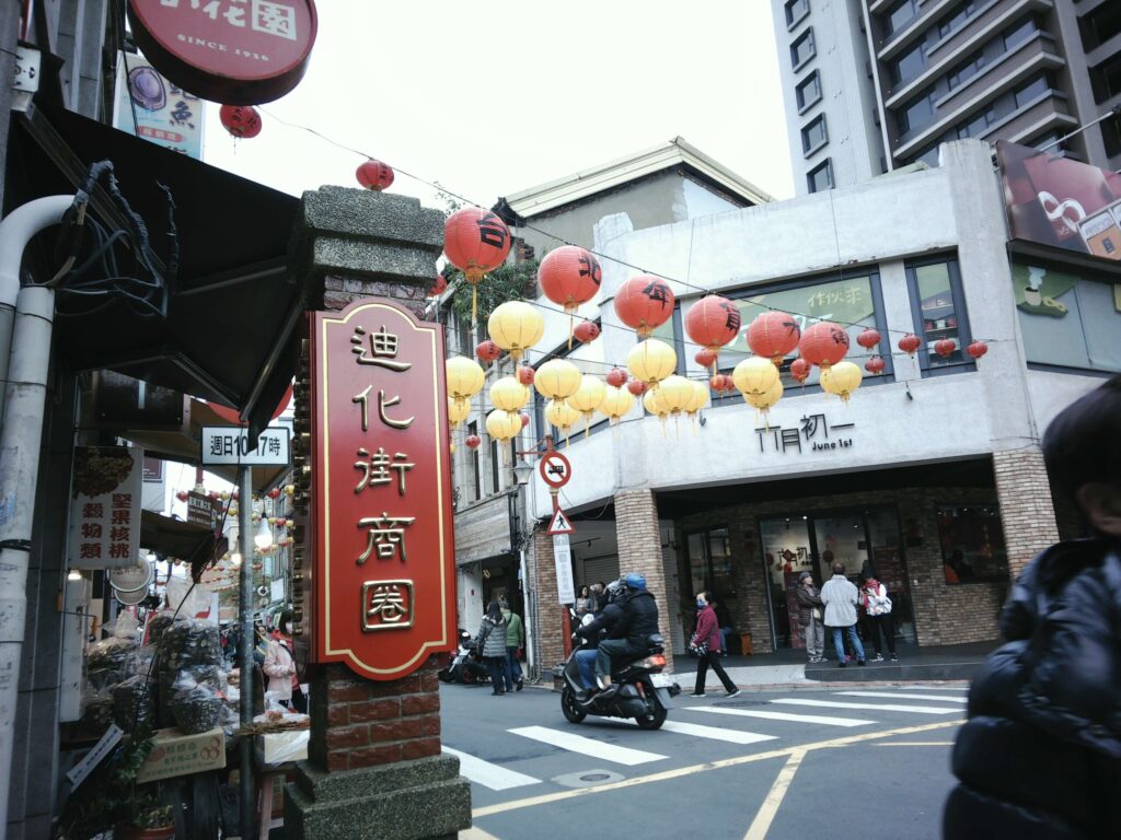 こちら台湾の迪化街の写真。赤い提灯と看板の色合いが印象的です!